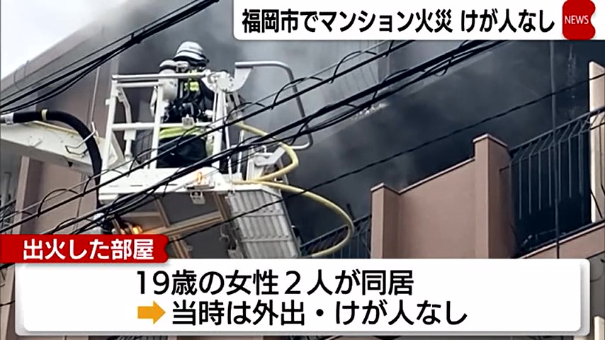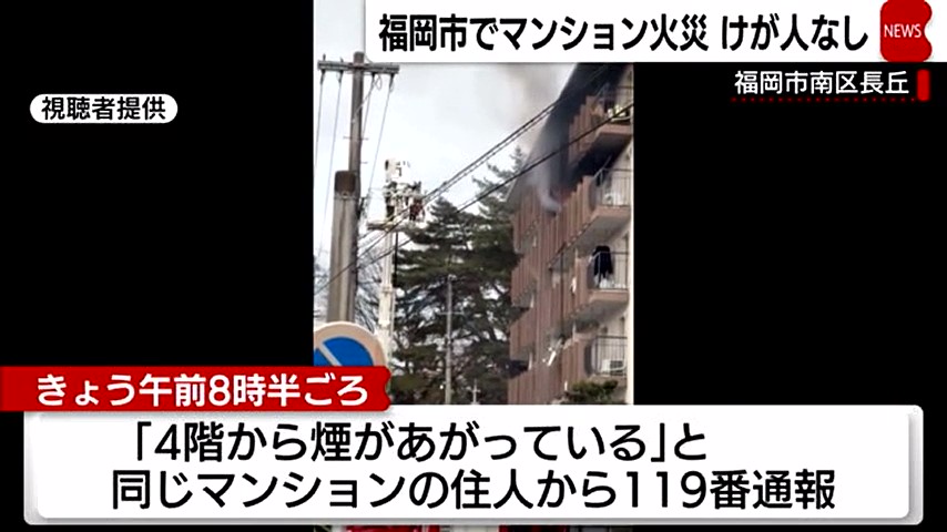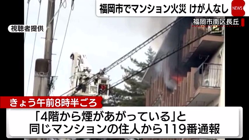 15日午前8時半ごろ、福岡市南区長丘のマンションで「4階から煙があがっている」と別の部屋の住人から119番通報がありました。