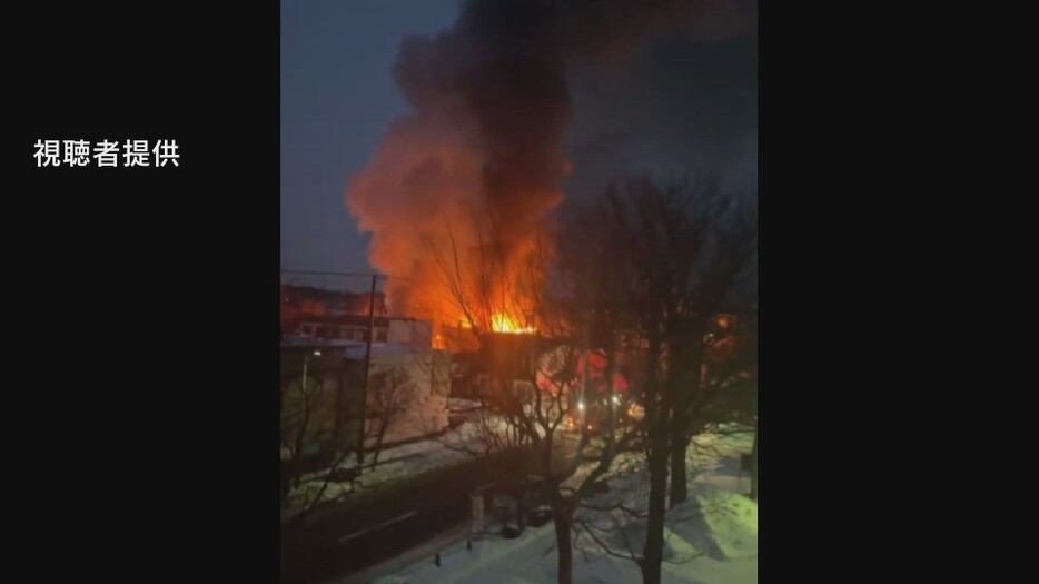 午前8時現在、鎮火しておらず消火作業が続いています。